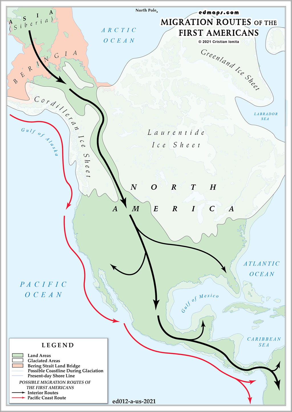 Some researchers propose additional routes, including possible Atlantic crossings or earlier arrival dates, though these remain controversial and require further archaeological validation.